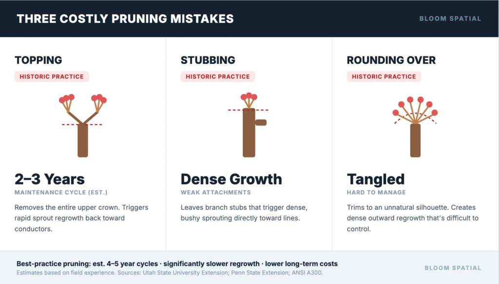 Most electric cooperatives inherited decades of historic trimming practices. Techniques like topping, stubbing, and rounding over cost less upfront but drive higher expenses over time. Switching to best-practice pruning requires training and supervision, but it pays off.