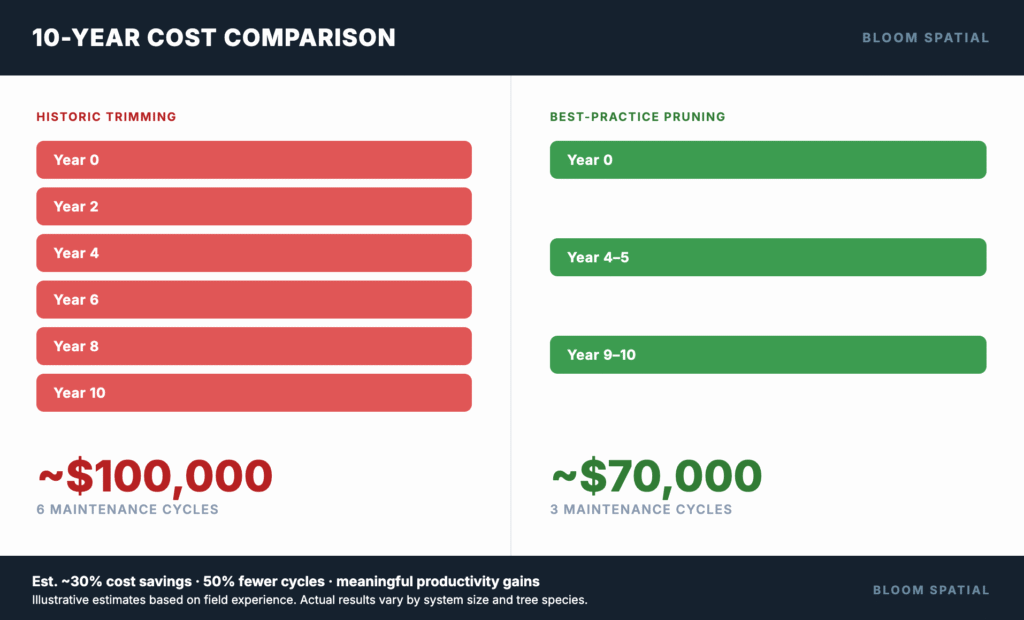 Best-practice pruning techniques slow tree growth toward conductors, often significantly, extending your maintenance cycle and cutting long-term costs.